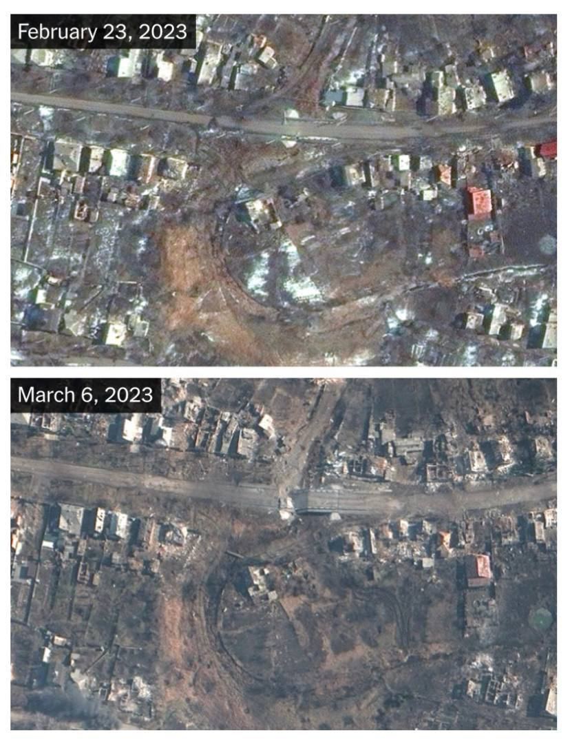 Российские войска продвинулись к северо-западу от Бахмута. Опубликованные 9 марта кадры с геолокацией указывают на то, что "Вагнер", вероятно, захватил Дубово-Васильевку (о чем ранее заявлял куратор ЧВК Пригожин).