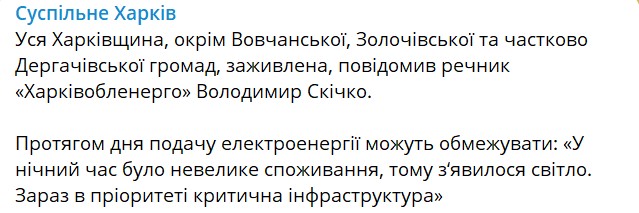Об этом заявили в пресс-службе "Харьковоблэнерго", сообщает "Суспильне".