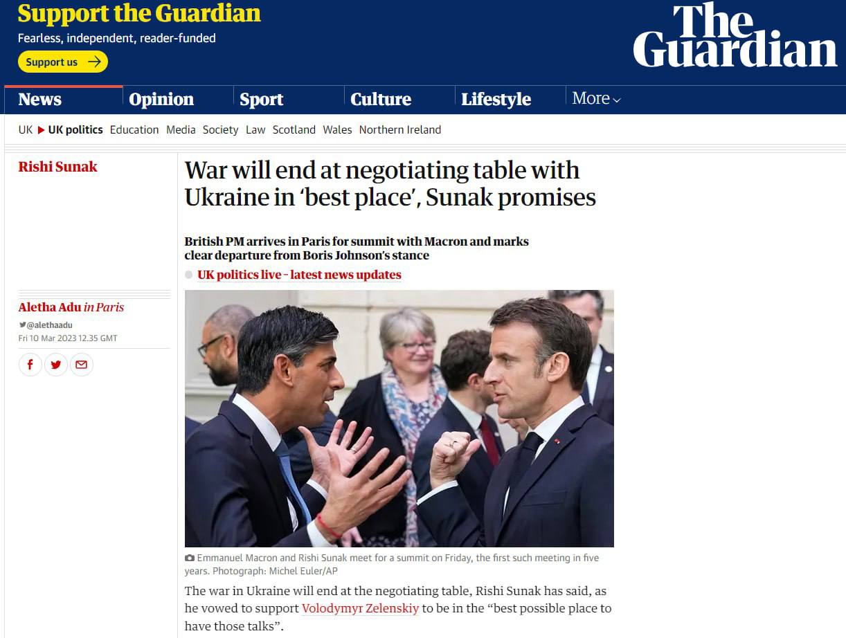 "Конечно, эта война закончится, как и все конфликты, за столом переговоров, но это решение за Украиной. И что нам нужно сделать, так это дать Украине наилучшую позицию для проведения этих переговоров в подходящий момент, который имеет для них смысл. Но на данный момент приоритетом должно быть предоставление им ресурсов, обучения и поддержки, в которых они нуждаются, чтобы продвигаться вперед и создавать преимущества на поле боя", - заявил Сунак в Париже перед встречей с Эммануэлем Макроном.