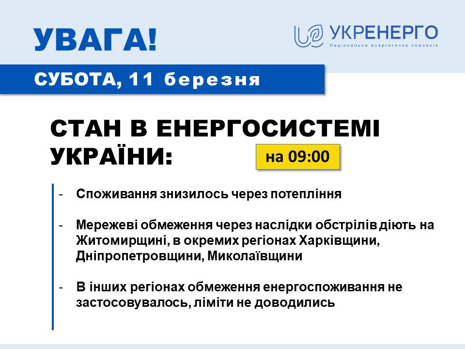 В остальной Украине также продолжается восстановление энергосистемы после массированной ракетной атаки 9 марта, сообщает "Укрэнерго" в своей сегодняшней сводке.