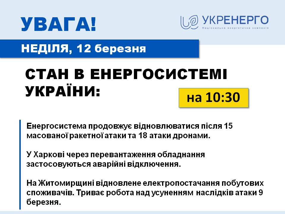В Харькове с утра воскресенья, 12 марта, применяются аварийные отключения из-за перегрузки оборудования, которое осталось в работе после ракетных атак в четверг, 9 марта. Также в течение дня возможны аварийные отключения в Харьковской области.