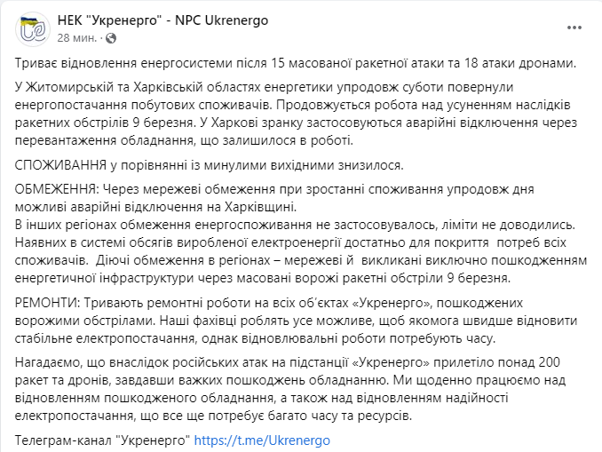 "Имеющихся в системе объемов производимой электроэнергии достаточно для покрытия потребностей всех потребителей. Действующие ограничения в регионах – сетевые и вызваны исключительно повреждением энергетической инфраструктуры из-за массированных вражеских ракетных обстрелов 9 марта", - говорится в сообщении.