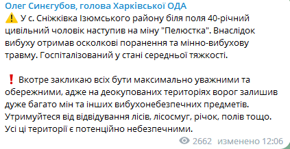 Подобных мин и других взрывоопасных предметов на территории Харьковской области россияне оставили после себя очень много. Нужно быть предельно осторожными, избегать посещений лесопосадок, полей, рек, обратился к населению Синегубов.