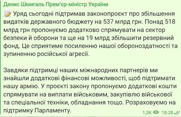 По его словам, более 518 млрд грн предлагаем дополнительно направить на сектор на выплаты военным, закупку военной и специальной техники, оборудования и т.д., а 19 млрд – отправить в резервный фонд.