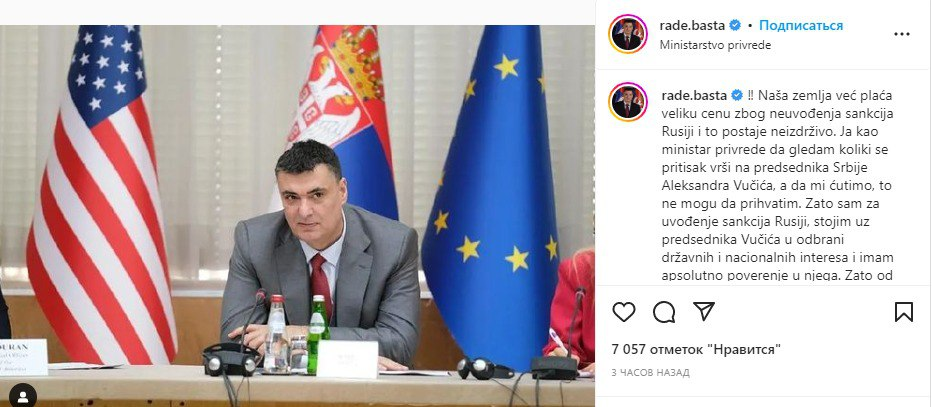 Позже первый вице-премьер Сербии также открестился от заявления министра экономики по вопросу антироссийских санкций.