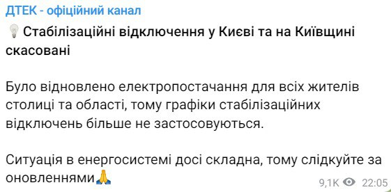 "Было восстановлено электроснабжение всех жителей столицы и области, поэтому графики стабилизационных отключений больше не применяются", – говорится в сообщении.