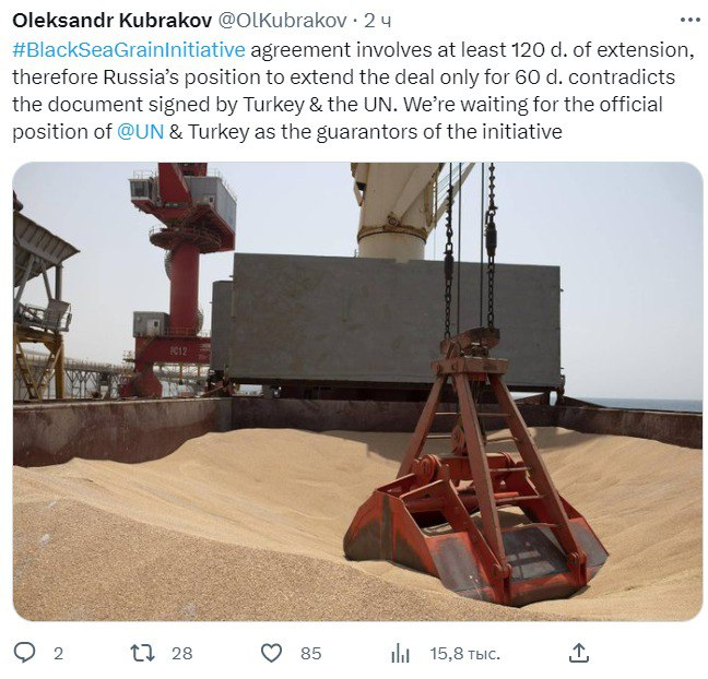 "Соглашение о Черноморской зерновой инициативе предусматривает продление как минимум на 120 дней, поэтому позиция России о продлении соглашения только на 60 дней противоречит документу, подписанному Турцией и ООН. Ждем официальной позиции ООН и Турции как гарантов инициативы", – заявил Кубраков.