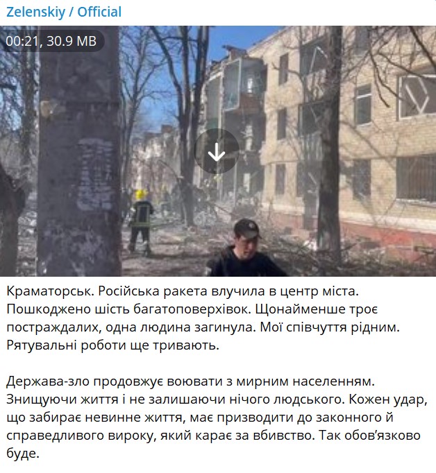 Президент Украины Владимир Зеленский сообщил об одном погибшем вследствие удара по Краматорску Донецкой области.