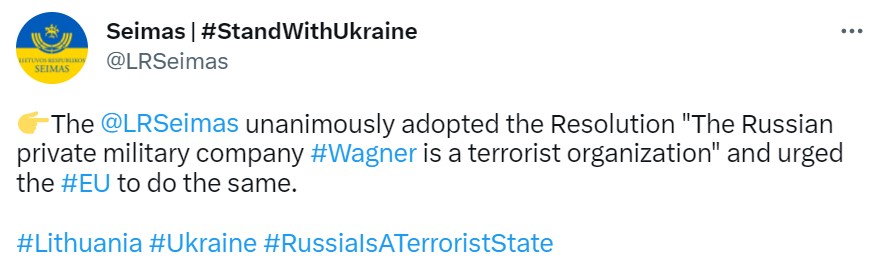 "Сейм Литвы единогласно принял резолюцию, что Российская частная военная компания Вагнер является террористической организацией и призвал ЕС сделать то же самое", - говорится в сообщении.