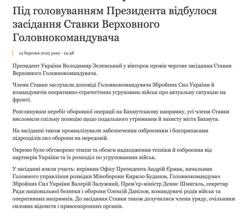 Президент Украины Владимир Зеленский провел заседание Ставки Верховного главнокомандующего, в ходе которой все члены ставки высказались за продолжение обороны Бахмута.