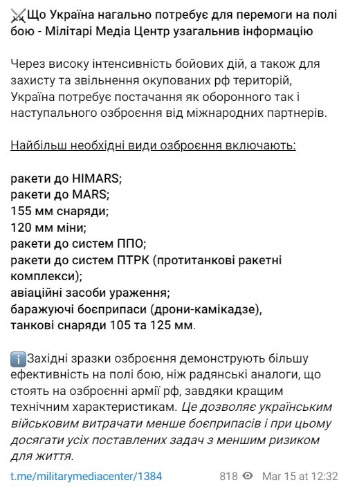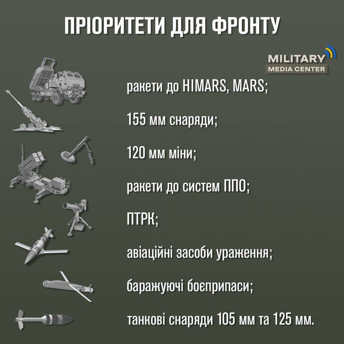 Military Media Center (структура при Минобороны) озвучил приоритеты Украины по запросам на поставки оружия на данный момент.