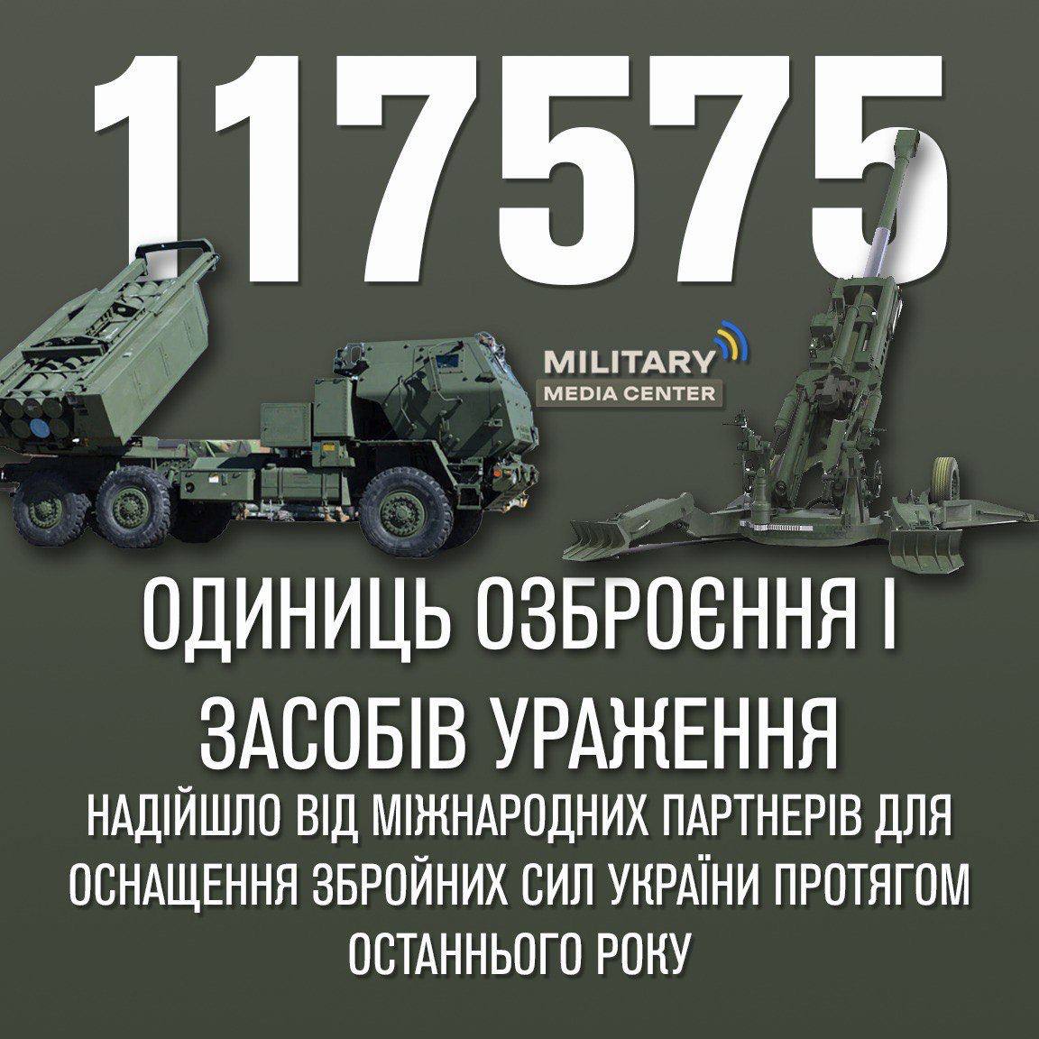 Также там сообщают, что за минувший год Украина получила от западных партнеров 117 575 единиц современного вооружения и средств поражения.