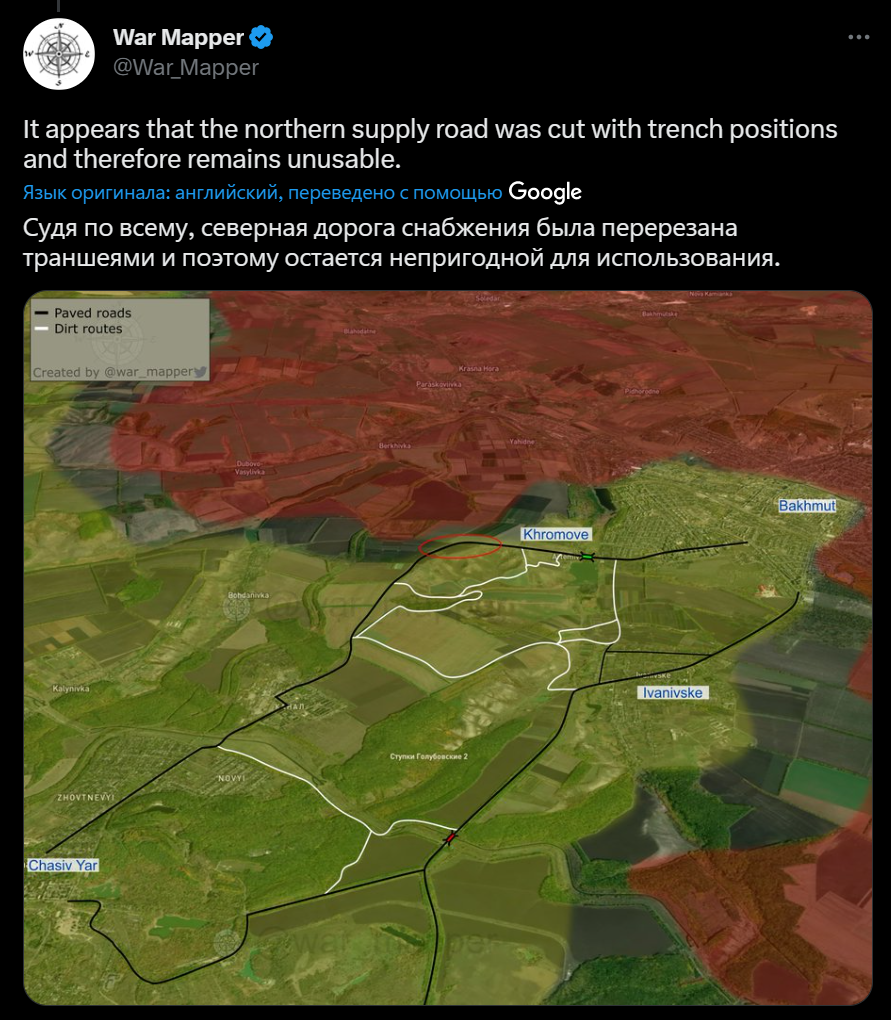 Также, судя по всему, российские позиции уже совсем близко от "дороги жизни", по которой снабжается Бахмут, - через Хромово. Британский военный блогер War Mapper утверждает, что "северная дорога снабжения (Бахмута - Ред.) была перерезана траншеями и поэтому остается непригодной для использования".
