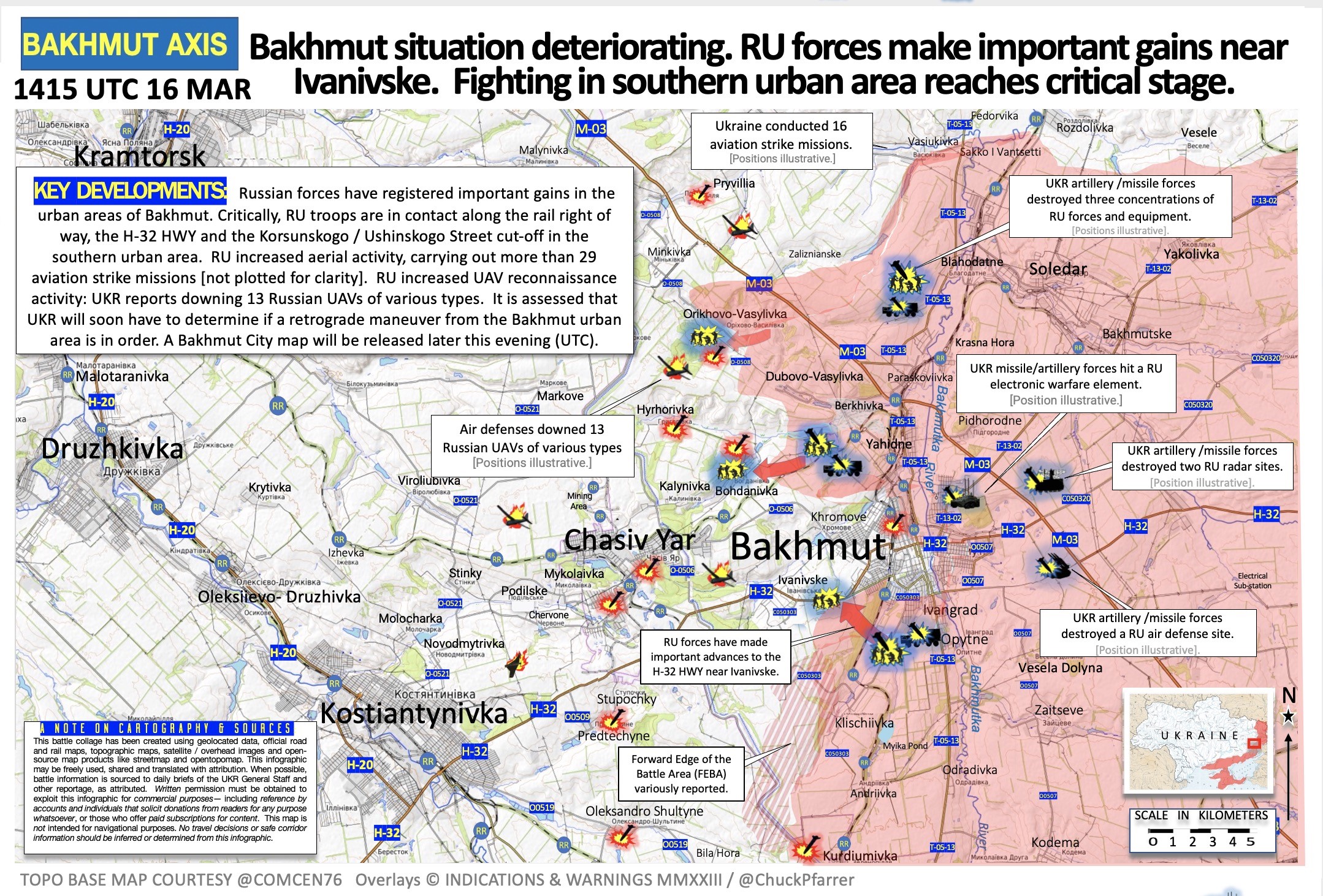Американский военный обозреватель Чак Пфаррер пишет, что российские войска "добились значительных успехов в городских районах Бахмута" и находятся вплотную к шоссе Н-32, которое идет на Красное и Константиновку (которая и сегодня была под интенсивным обстрелом, поскольку через нее идет снабжение Бахмута).