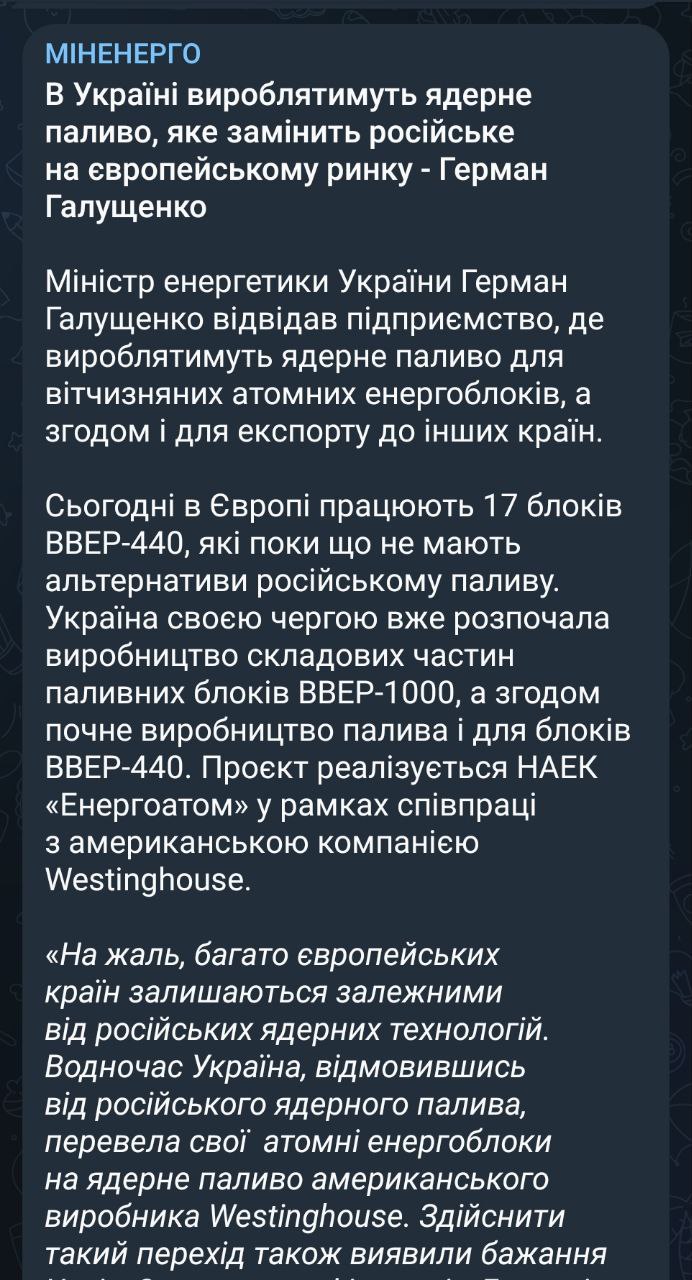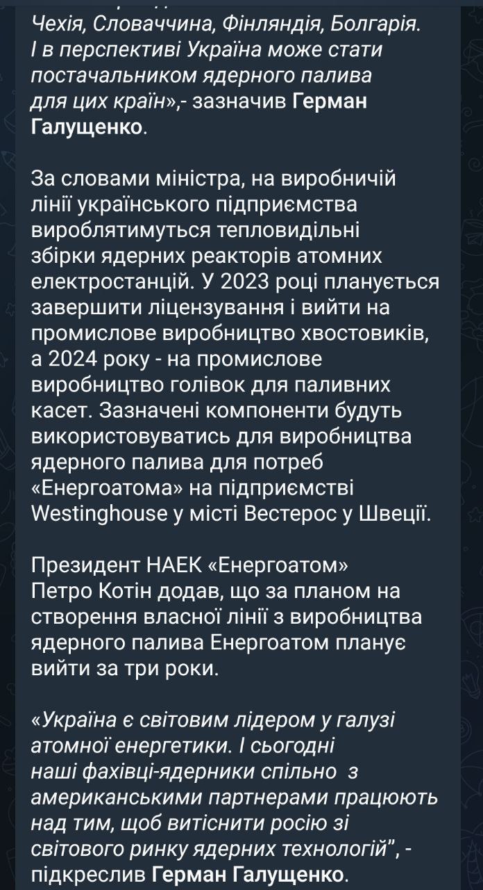 Покупателями такого топлива могут стать Чехия, Словакия, Финляндия, Болгария, которые зависят от российского ядерного топлива. "В перспективе Украина может стать поставщиком ядерного топлива для этих стран", – отметил Галущенко .