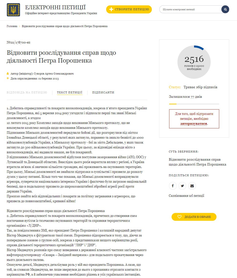 Автор петиции предлагает привлечь к ответственности Порошенко и других чиновников, которые подписывали "Минские соглашения", "Комплекс мероприятий по выполнению Минского протокола", а также причастных к созданию схем поставок угля с территории "ЛДНР".