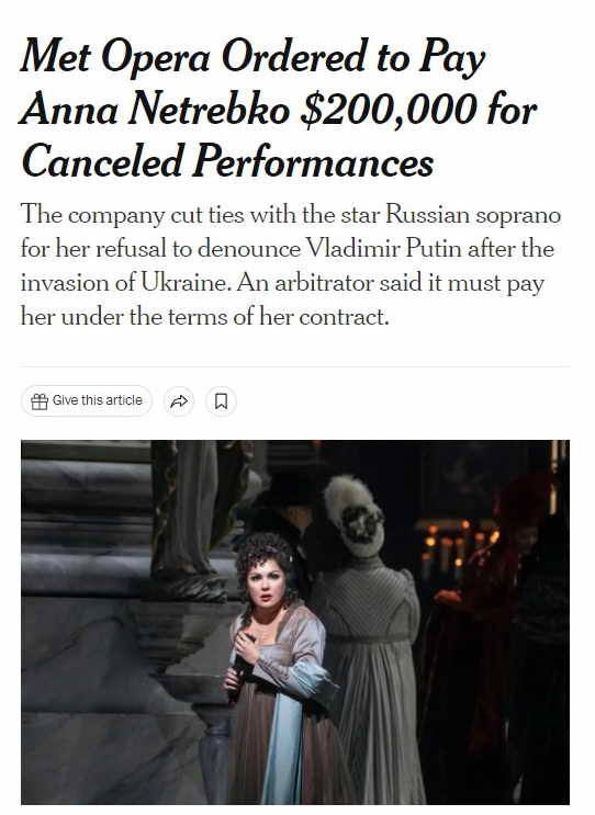 Формальным поводом для отмены концертов стало то, что певица отказалась осудить действия Путина. Тем самым, как посчитала "Метрополитен-опера", Нетребко нарушила пункт договора, который регламентирует публичное поведение сторон.
