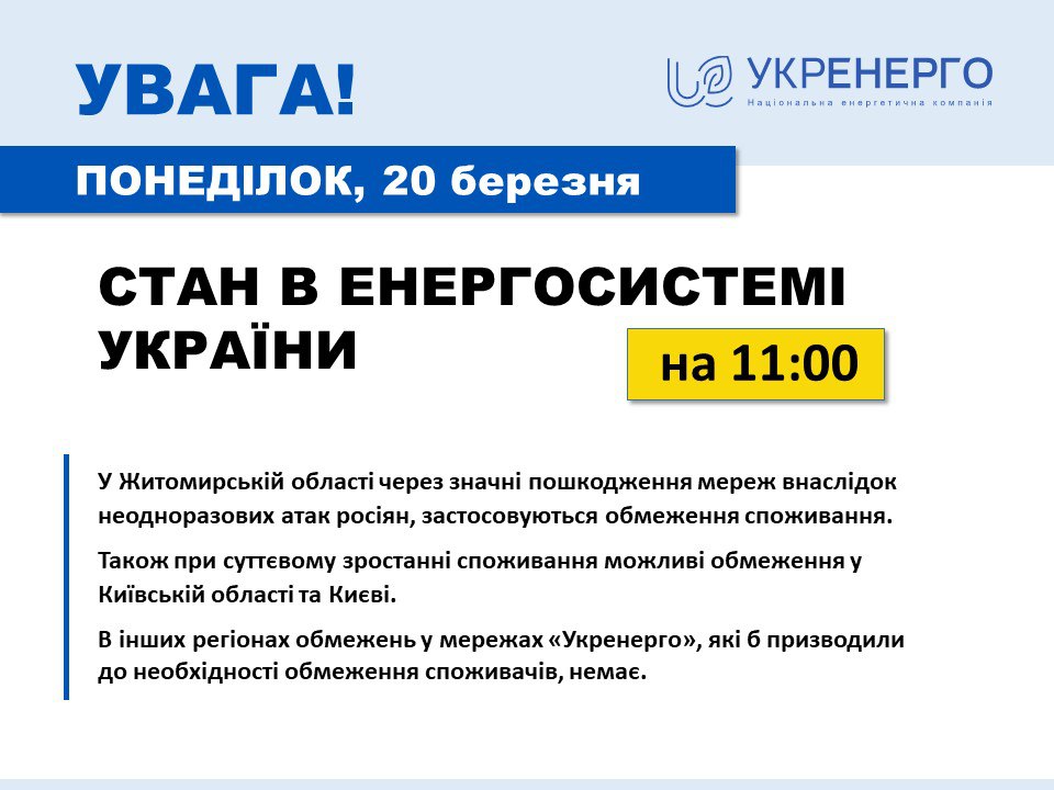 11.05 В Житомирской области из-за значительных повреждений сетей применяются ограничения потребления. Также возможны в случае роста потребления ограничения в Киеве и Киевской области, сообщает Укрэнерго.