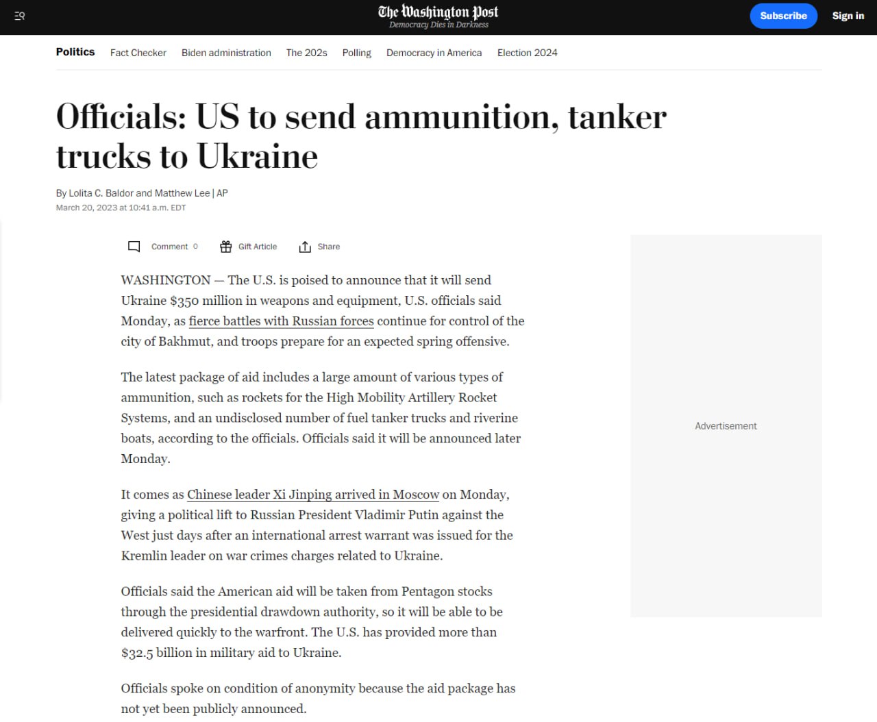 - Прокомментировал план ЕС по поставкам снарядов в Украину стоимостью 2 млрд евро и новый оборонный пакет США стоимостью 350 млн долларов.