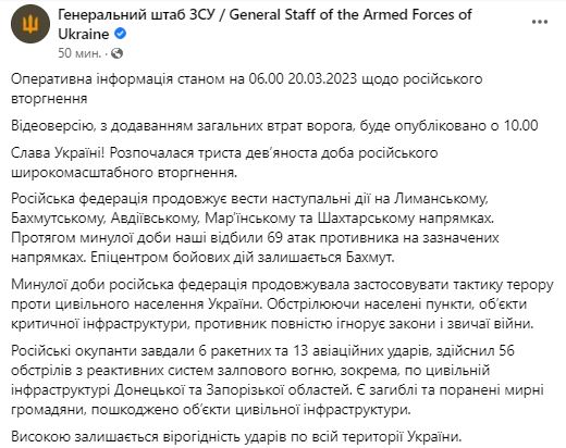 В понедельник, 20 марта, Генштаб ВСУ обнародовал сводку о ситуации на фронте.