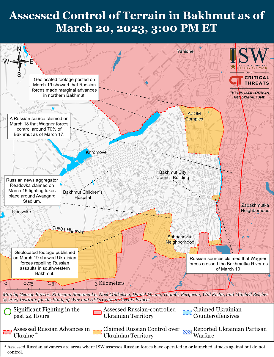 По состоянию на 20 марта российские войска, "вероятно, добились дополнительных успехов на юго-западе и севере Бахмута, а также на северо-западе Бахмута между Богдановкой и Хромовым".