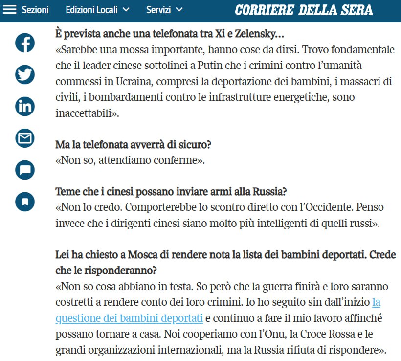 10:05 Украина ждет подтверждения телефонного разговора Зеленского с Си Цзиньпином, сообщила Ирина Верещук итальянской газете Corriere della Sera.