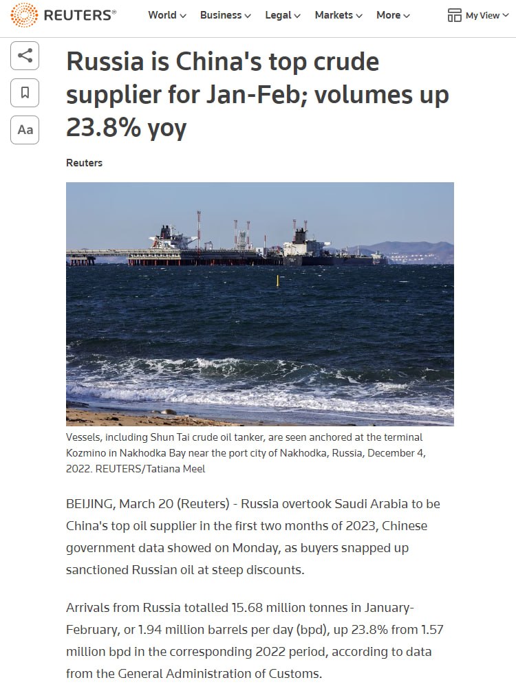 За первые два месяца 2023 года Россия увеличила продажи сырой нефти в Китай на четверть и стала крупнейшим поставщиком нефти в КНР, обогнав Саудовскую Аравию.