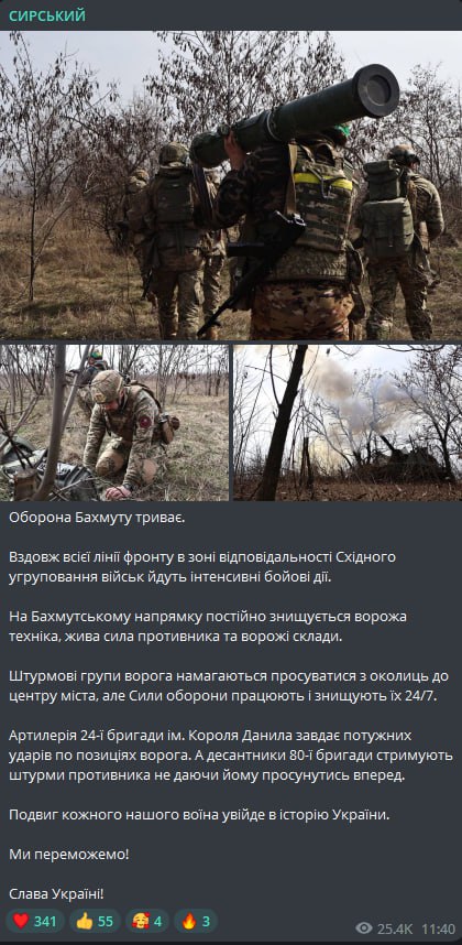 "На Бахмутском направлении постоянно уничтожается вражеская техника, живая сила противника и вражеские склады. Штурмовые группы врага пытаются продвигаться из окрестностей в центр города, но Силы обороны работают и уничтожают их 24/7", - говорится в сообщении.