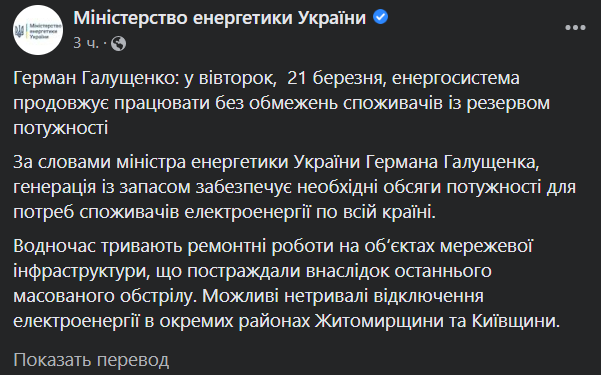 Во вторник, 21 марта, энергосистема Украины продолжает работать без ограничения потребителей с резервом мощности, однако из-за повреждения сети потребителям в Киевской и Житомирской областях могут отключать свет.