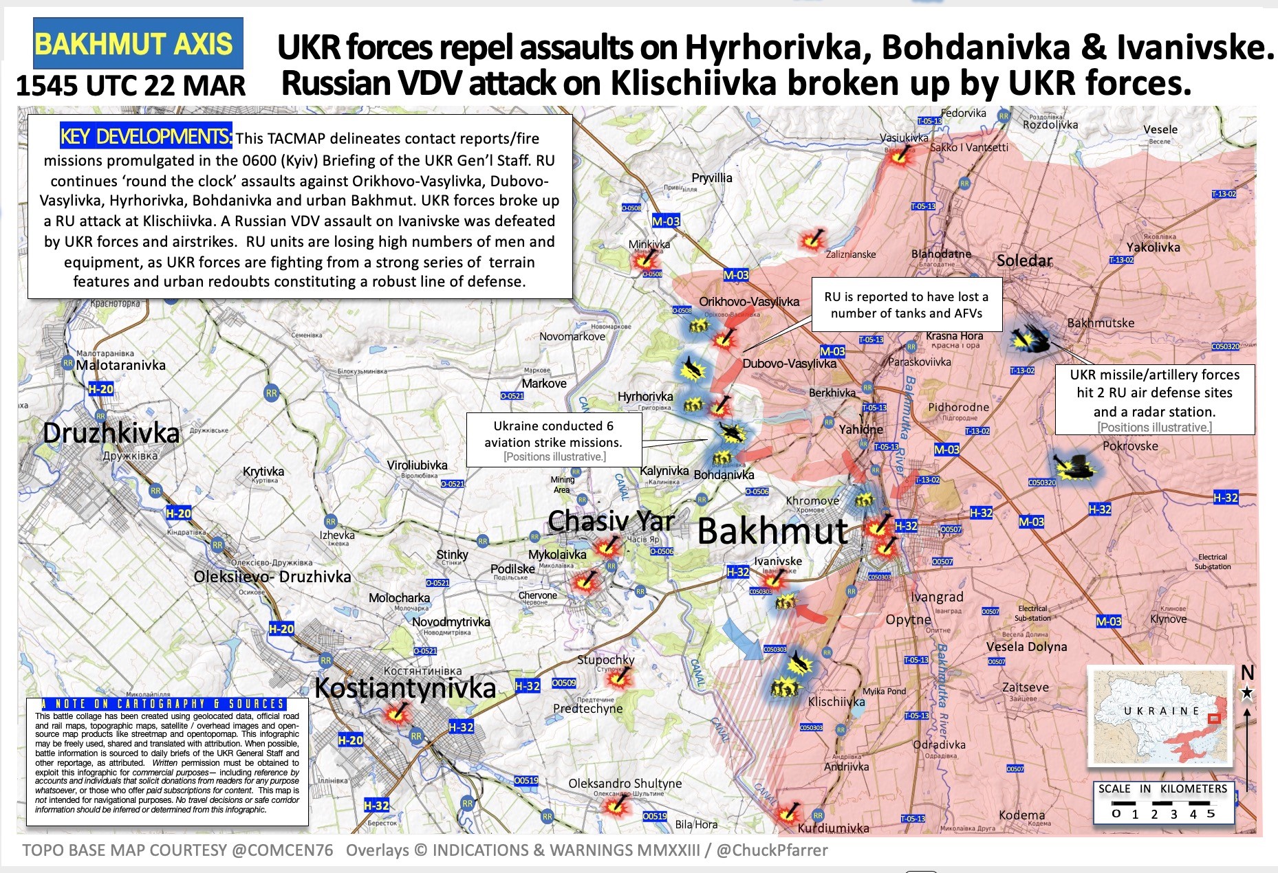 Британская разведка сообщает, что в последние дни ВСУ провели локальную контратаку западнее Бахмута, которая может ослабить давление на маршрут снабжения по трассе H32 (связывает Бахмут и Константиновку).
