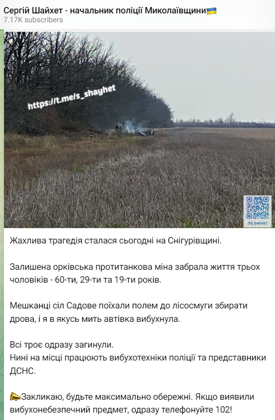 Также мы сообщали, что в Харьковской области у села Спиваковка работник хозяйства и трое мужчин, которые ехали с ним в авто, подорвались на противотанковой мине. Все четверо погибли на месте.