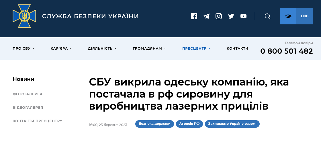 СБУ заявляет, что разоблачила в Одессе компанию, которая поставляла в Россию сырье для производства лазерных прицелов.