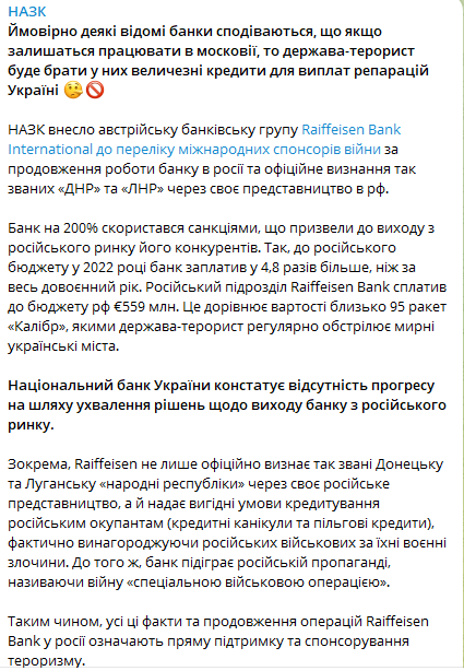 "Банк на 200% воспользовался санкциями, повлекшими выход из российского рынка его конкурентов. Так, в российский бюджет в 2022 году банк заплатил в 4,8 раза больше, чем за весь довоенный год. Российское подразделение Raiffeisen Bank уплатило в бюджет России €559 млн. Это равно стоимости около 95 ракет "Калибр", которыми государство-террорист регулярно обстреливает мирные украинские города. Национальный банк Украины констатирует отсутствие прогресса для принятия решений по выходу банка с российского рынка", - сообщает НАПК.