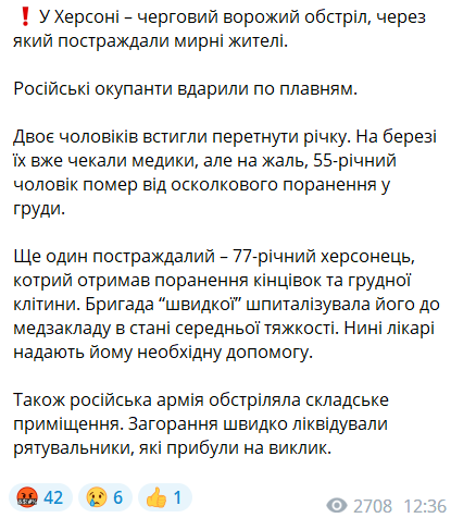 Напомним, российские войска за минувшие сутки 74 раза обстреляли Херсонскую область из тяжелого вооружения и "Градов", выпустив 423 снаряда. В результате атак один человек погиб.