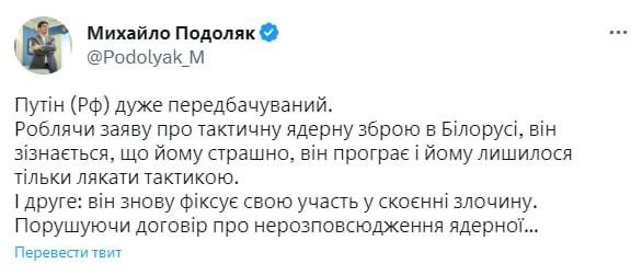 "Путин (Рф) очень предсказуем. Делая заявление о тактическом ядерном оружии в Беларуси, он признается, что ему страшно, он проиграет и ему осталось только пугать тактикой. И второе: он снова фиксирует свое участие в совершении преступления. Нарушая договор о нераспространении ядерной...", - написал он.