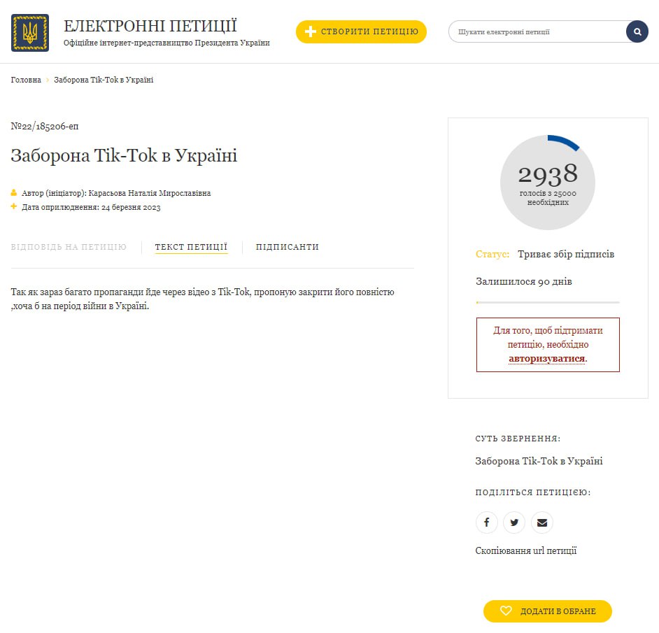 12.05 На сайте президента появилась петиция с призывом запретить TikTok на территории Украины.