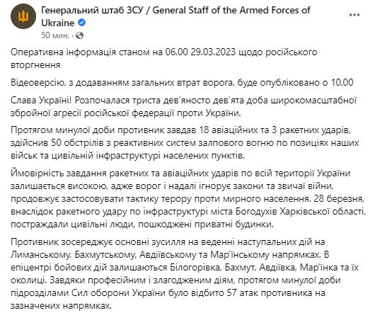 В среду, 29 марта, в Украине идет уже 399-й день войны с РФ.