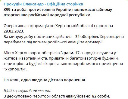 07.40 За прошедшие сутки РФ трижды обстреляла Херсон. 17 снарядов попали в жилые кварталы города, частные и многоквартирные дома, территорию и здания больницы, а также производственное помещение "Укрпочты". Один человек получил ранения.