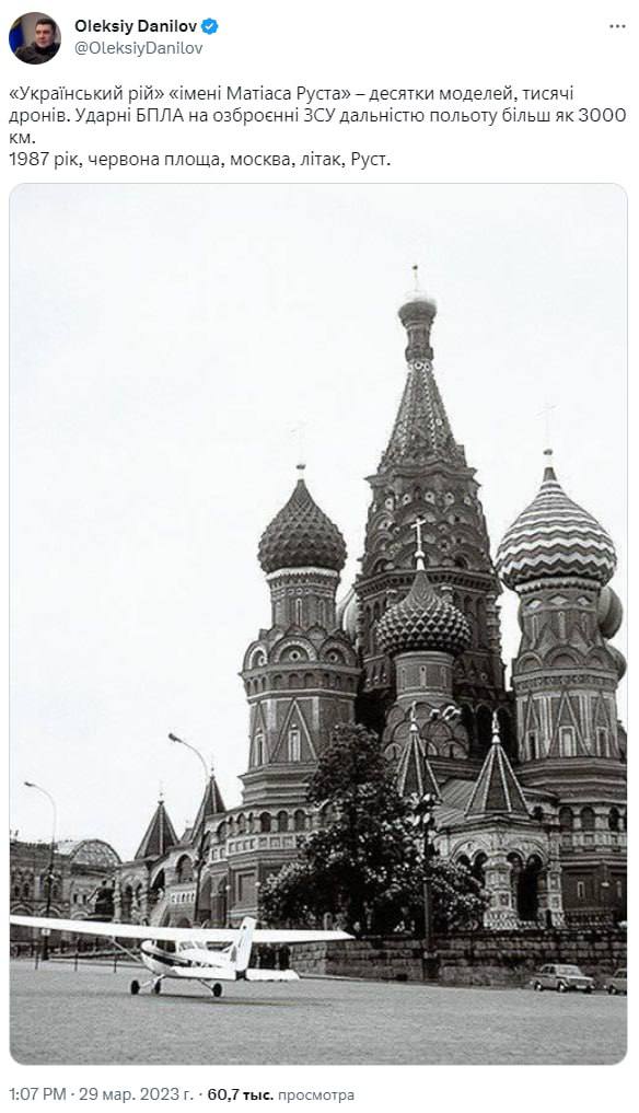 Свой твит он сопроводил знаменитым снимком 1987 года, когда немецкий пилот-любитель Матиас Руст посадил самолет на Красной площади.