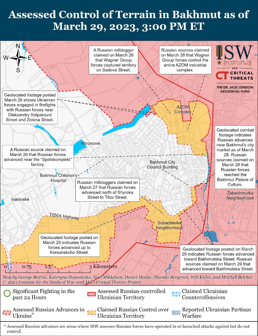 Геолокационные кадры, опубликованные 28 и 29 марта, показывают, что российские войска продвигались в южном и юго-западном Бахмуте.