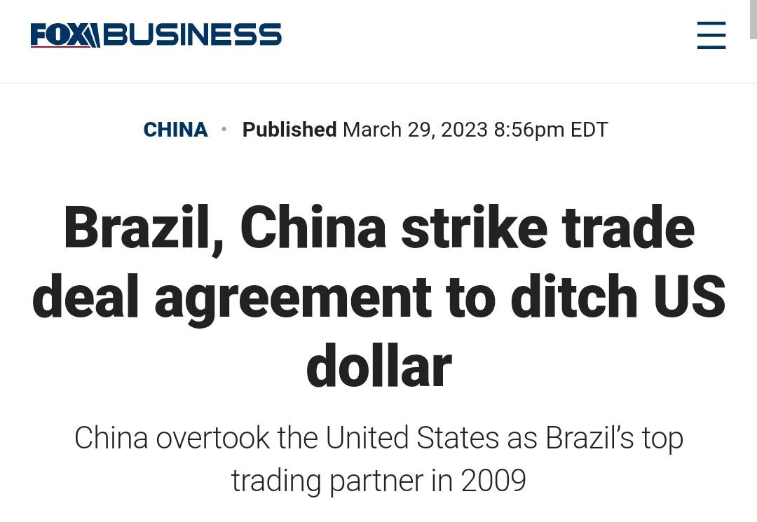 08:31 Бразилия и Китай заключили соглашение об отказе от доллара в пользу своих валют - юаня и реала.