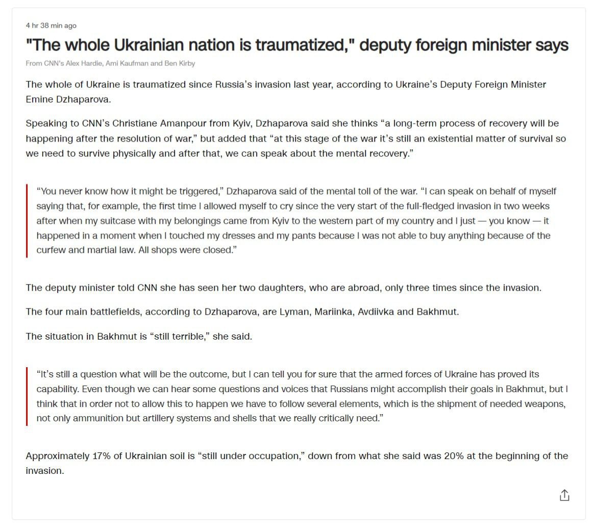 08:37 Лиман, Марьинка, Авдеевка и Бахмут - на данный момент четыре основных поля боя в Украине, ситуация в Бахмуте "по-прежнему ужасная", заявила заместитель министра иностранных дел Эмине Джапарова в комментарии CNN.