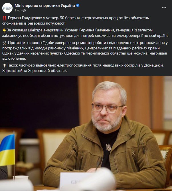 10:58 В некоторых населенных пунктах Одесской и Черниговской областей сегодня еще возможны непродолжительные отключения, сообщает министр энергетики Герман Галущенко.