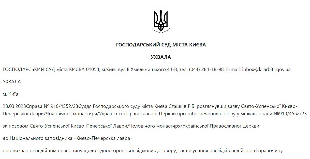 В иске указана необходимость запрета Заповеднику "Киево-Печерская лавра" на время суда предпринимать любые действия, направленные на препятствование религиозной общине.