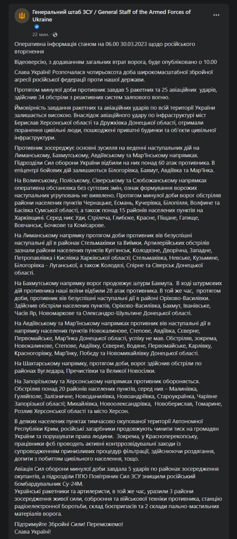 Утром в четверг, 30 марта, Генштаб ВСУ опубликовал актуальную сводку о происходящем на фронте. Сообщается, что в эпицентре боевых действий остаются Белогоровка, Бахмут, Авдеевка и Марьинка.