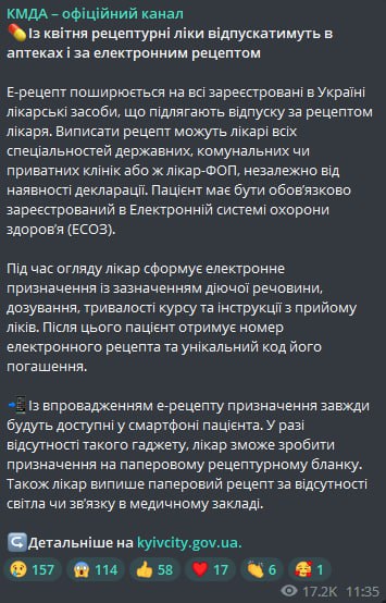 "В случае отсутствия такого гаджета врач сможет сделать назначение на бумажном рецептурном бланке. Также врач выпишет бумажный рецепт при отсутствии света или связи в медицинском заведении", - сообщили в КГГА.