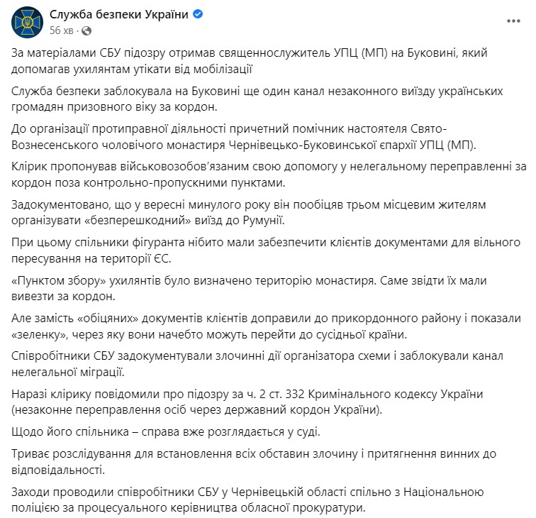 Служба безопасности Украины заблокировала канал незаконного выезда мужчин призывного возраста за границу на Буковине. По данным СБУ, к ней был причастен священнослужитель УПЦ, ему сообщили о подозрении.