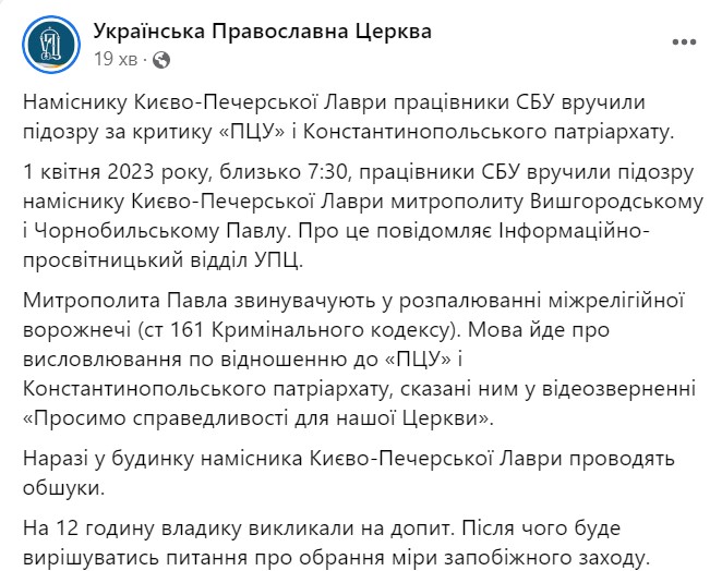 Тем временем УПЦ сообщила, что митрополит подозревается в разжигании межрелигиозной розни (статья 161 Уголовного кодекса).