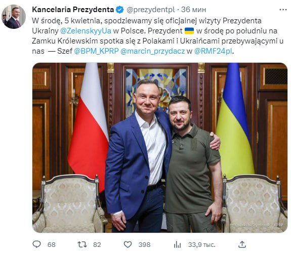 Президент Украины Владимир Зеленский в среду, 5 апреля, приедет с официальным визитом в Польшу.