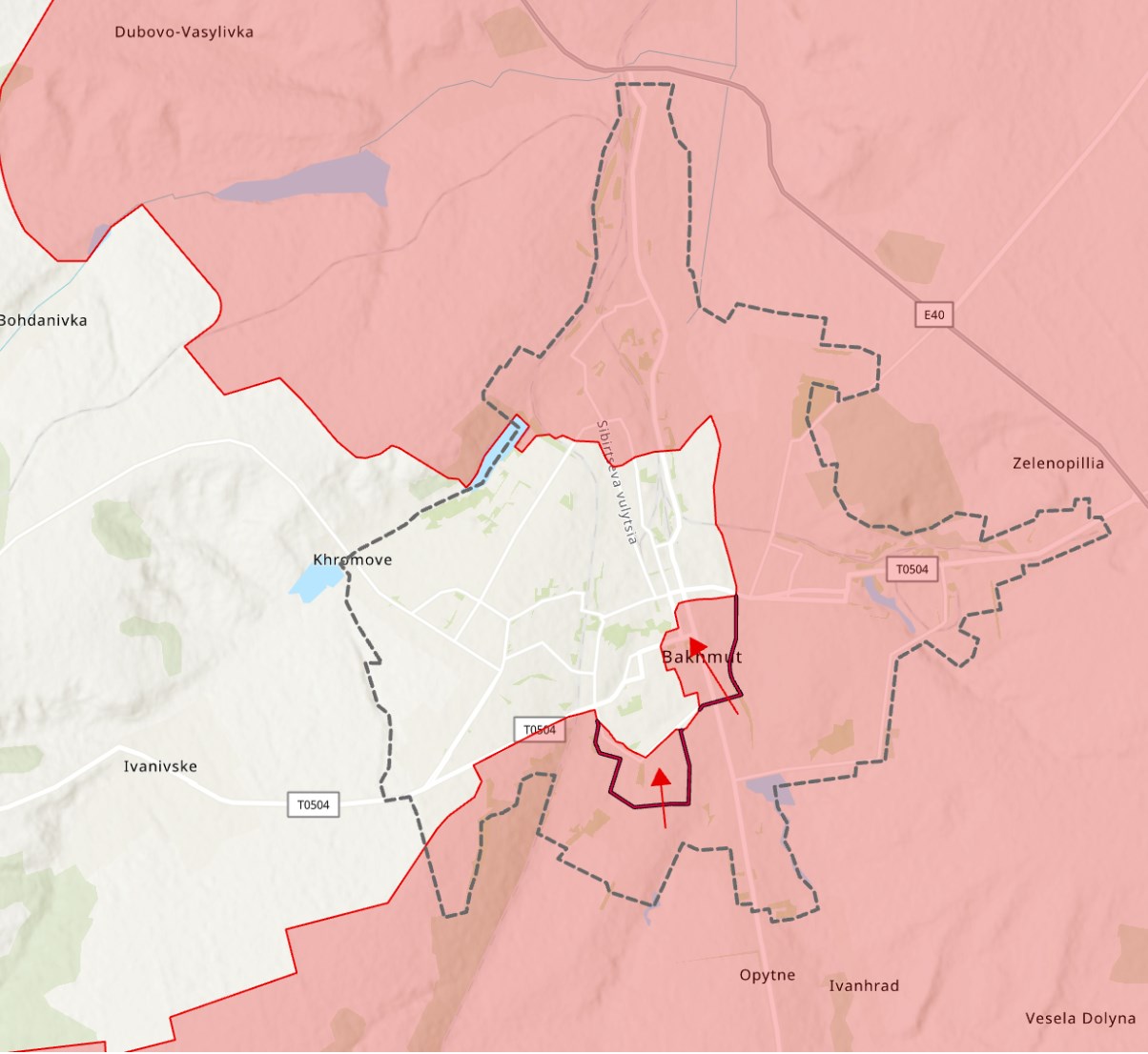 Как указывает популярный военный обозреватель Warmapper "подразделения российской ЧВК "Вагнер" захватили здание горсовета, расположенное в центре города, двигаясь на север вдоль берега реки Бахмутовка. Украинские силы, возможно, частично отошли из других районов в центре города, чтобы не быть отрезанными".